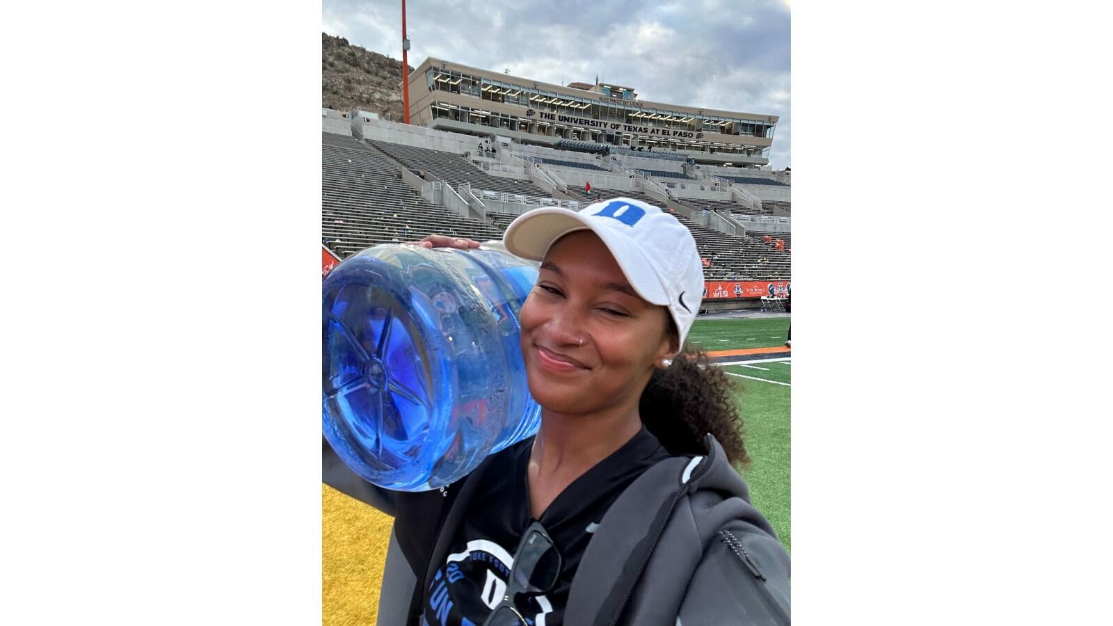 On the afternoon of New Year’s Eve, she assisted in setting up on the sidelines, making sure the defense players stayed well hydrated and assisting athletic trainers with rehab. The Duke Blue Devils won the game against the Arizona State Sun Devils 42 to 39.
